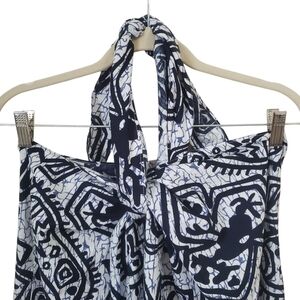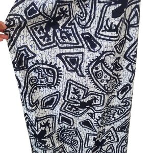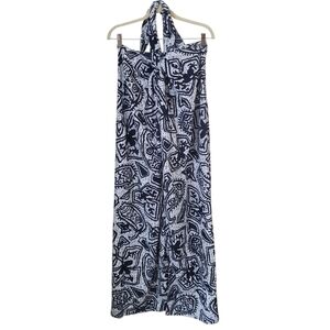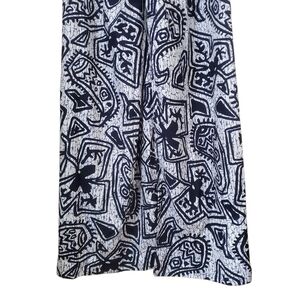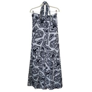 vintage Hukilau Fashions wrap dress, made in Hawaii. Featuring a bold black and white tribal-inspired island print, this strapless maxi dress ties at the neck and features a sexy high front slit for a dramatic silhouette. The 65% polyester / 35% cotton fabric has a lightweight feel with slight texture, perfect for warm-weather getaways, beach vacations, poolside lounging, or tropical events.