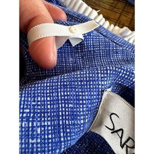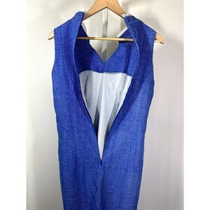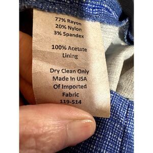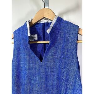 Slip on with concealed back zip closure. V-neck. Stand up collar with accordian pleat trim. Sleeveless. Two front pockets. Blue and white nubby textured stretch fabric. White trim. Stretch material. No liner. Resort. Snowbird. Preppy. Classic. Timeless. Sophisticated.