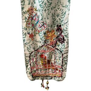 Pier 1 Imports Bohemian Caged Birds Butterfly Silky Floral Print Table Runner. Very good preowned condition, no tags. 3D sewn birdcage with butterfly and floral embroidery on a silky fabric with beaded tassel detail