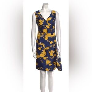 $2,300 Carolina Herrera A-Line Fit Flare Dress Navy Yellow Gold V-Neck 10 12
