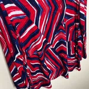 New Directions Red Blue White Pattern Tunic Large. Preowned and in great condition. Top is light weight and flowy with stretch. Mostly polyester so no wrinkles. Great colors for Americana holidays. Please see all photos. Approx measurements in pictures.