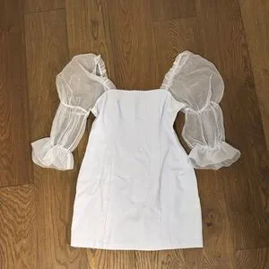 Elegant mini dress with sheer puff sleeves. Perfect for a chic look.