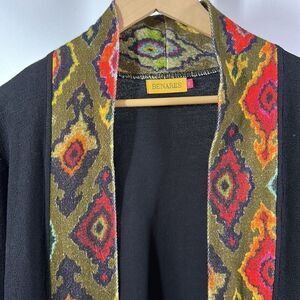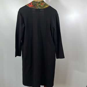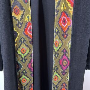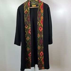 Open front style. Long sleeves. Knee length. Side slant pockets. Black with olive green, red, blue, and yellow geometric print contrast trim. Not much stretch to material.