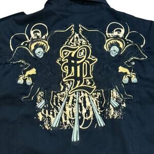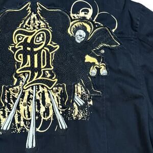 Blac Label 68 Shacket Mens Black Gold Embroidered Skulls Iron Cross Shirt ~XL