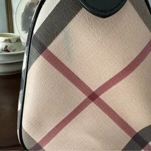 Stylish Burberry tote with iconic checkered pattern. Features pink and black design. Elegant and versatile. Small mark on the side that I’ve not been able to remove. It looks like it could be a faded blue pen mark.