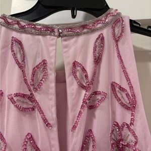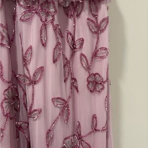 Charming pink maxi dress with floral embroidery. Sleeveless design. Ideal for special occasions.
