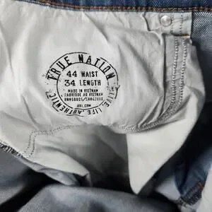 Men’s True Nation Relaxed Fit Jeans in size 44x34. Classic blue denim with a comfortable relaxed cut, perfect for everyday wear. Features a five-pocket design with distinctive back pockets, button fly, and belt loops. These jeans are part of the DXL line, made for big and tall sizing. Soft, broken-in feel with some light natural fading from wear, but no stains, holes, or major flaws.