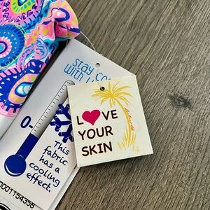 Brand new with tags Lulu B sleeveless dress in a vibrant pink blue and turquoise paisley print. Lightweight stretchy fabric with built in UPF 50 sun protection and a cooling effect so it is perfect for hot weather beach vacations golf or everyday summer wear. Flowy easy fit with a flattering neckline and soft comfy feel. Size Large. Original retail price 89.99. Never worn and from a smoke free home.
