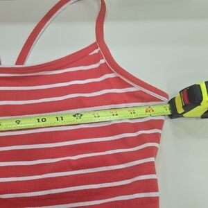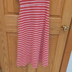 Stylish orange and white striped midi dress by Pact. Features a flattering fit and flare elegant design. Ideal for any occasion.