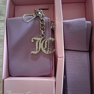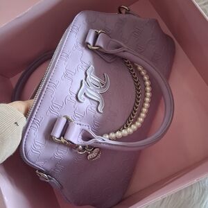 Chic Juicy Couture satchel in lavender. Features elegant pearl chain accent. Perfect for a stylish look. This is a hard to find item and perfect for holiday gift giving!