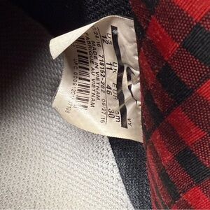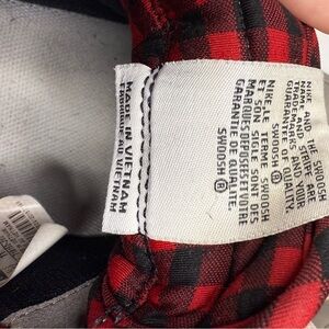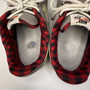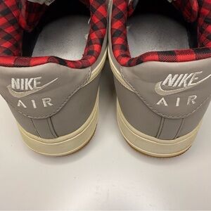 Stylish Nike Air sneakers in gray with cream details. Features a bold red plaid interior.
