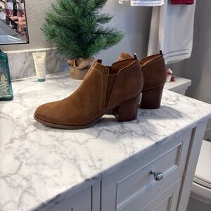 Stylish copper suede ankle booties with a sleek design. Pull on style with a 2-3/4” heel. Worn once.