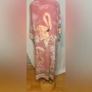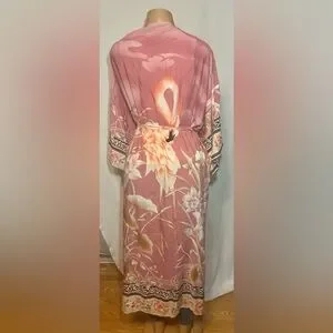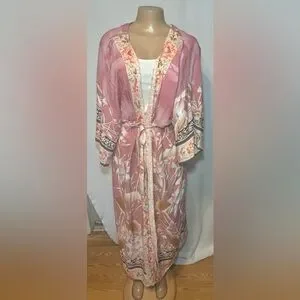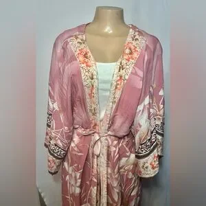 Elegant floral kimono jacket in a soft pink tie waist oversized fit. Great for layering . Very sophisticated yet casual and classy . New without tags .