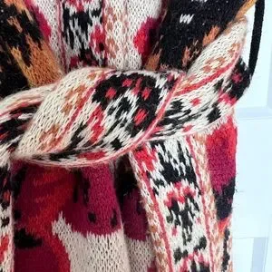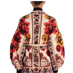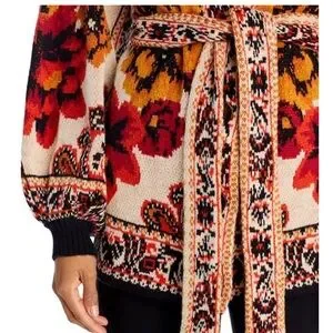Vibrant floral cardigan with a bold design. Features a tie belt and intricate patterns.