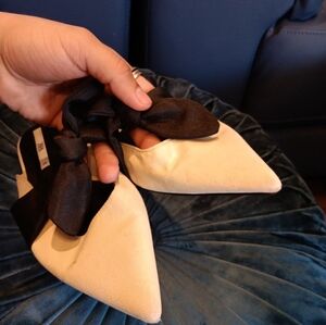 Step out in style with Zara's elegant mules, featuring a chic black bow on a cream base. Perfect for any occasion.