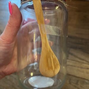 New with tags. Set of two clear glass jars featuring red metal lids and attached wooden spoons. Perfect for kitchen storage or homemade gifts.