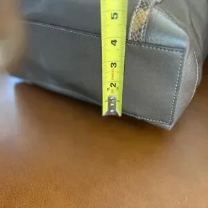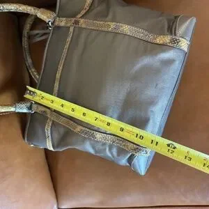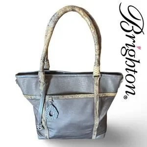 Like New "Pretty Tough" Reed tote bag in a metallic pewter color with snake-print leather accents. This bag features a soft, pebbled leather body, braided leather handles, and a signature Brighton charm. It has a cell phone pocket inside and a center zip pocket with another zip pocket. The exterior includes two side slip pockets. The bag's dimensions are approximately 16 inches in width.