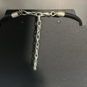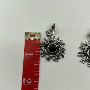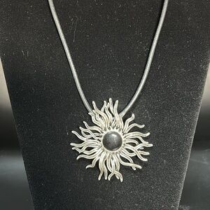 Beautiful silvertone starburst necklace and earring set. Leather strap is approx 15”. The price extender chain is approx 3 1/2”