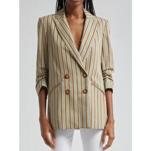 Veronica Beard 'Kiernan' double-breasted dickey jacket featuring tailored details, ruched sleeves and a classic stripe print.