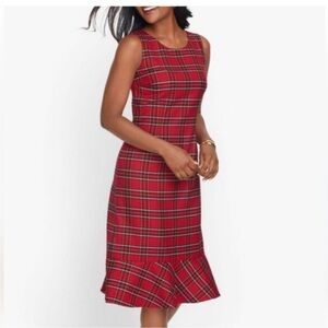 Chic red plaid midi dress by Talbots. Features a sleeveless design with a ruffled hem. Perfect for versatile styling. Perfect for the holidays. Lined for comfort. Wool, viscose, poly, spandex
