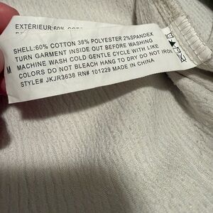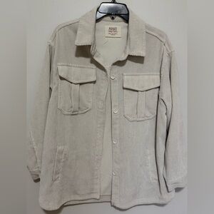 Elegant corduroy jacket by Ashley. Off-white cream color with button details and pockets. Oversized fit, great for leggings.