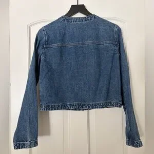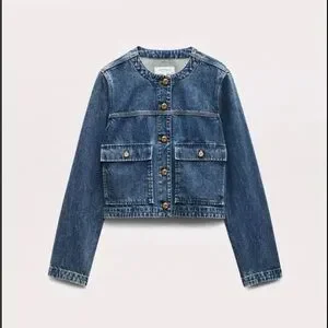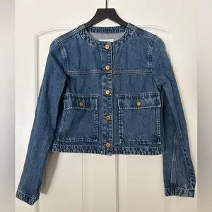 Chic blue denim jacket featuring gold buttons. Perfect for casual wear.