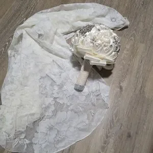 Beautiful ivory cream satin rose bridal bouquet adorned with pearls and rhinestone brooches. Perfect for weddings or special occasions.