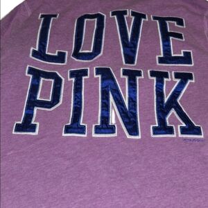 Details: Features the iconic "LOVE PINK" appliqué lettering on the back in satin navy blue with white trim, and a small blue dog logo on the chest.