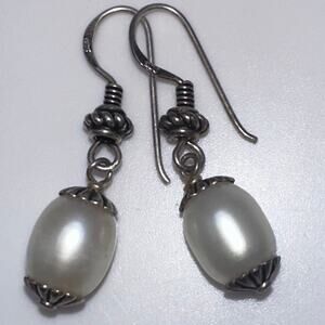 Excellent condition, shows hints of tarnishing. These beauties suspend white oblong freshwater pearls with a gorgeous iridescent luster. Weight is 3.56 grams. Please see photos for measurements in inches.