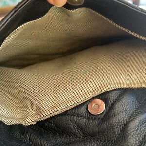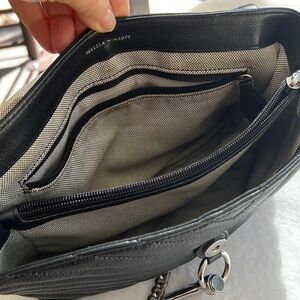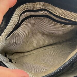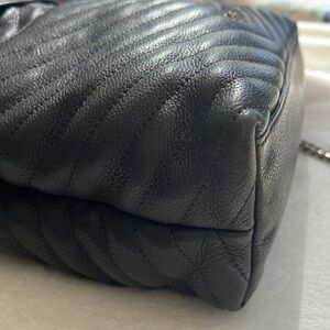This is a great Rebecca Minkoff Black Pebbled Leather Edie Crossbody Shoulder Bag. Very good pre owned condition. The leather, including corners and edges are in excellent condition. The interior linen lining shows mostly normal wear and the metal hardware and chain does show some darkening patina. The bag opens to a double compartment with an additional full zipper compartment and wall zipper pocket. Back of the bag has a full size magnetic closure slip in compartment. Logo shank and authenticity tags are all intact. No odors. No tears.