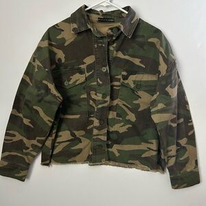 Stylish camouflage button-up jacket. Features a classic design with front pockets.