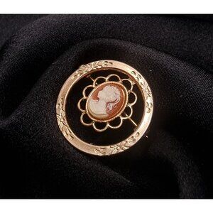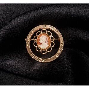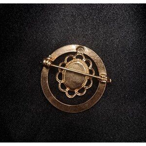 Vintage Gold-Tone Resin Cameo Brooch With Floral Detailing & Scalloped