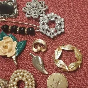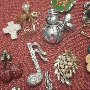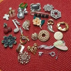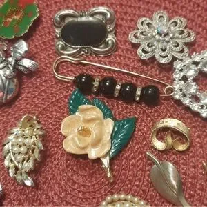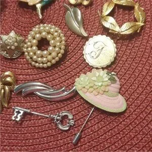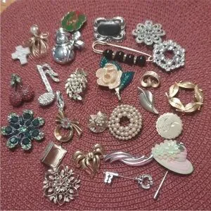 Discover a stunning collection of gold and silver brooches, perfect for adding a touch of elegance to any outfit. These beautifully crafted pieces feature intricate designs and vibrant colors, making them a must-have for any jewelry lover. I add and delete pieces occasionally. So there may be a few new ones and a couple not here anymore due to damage or the pin not working. Only including all that are in great shape.