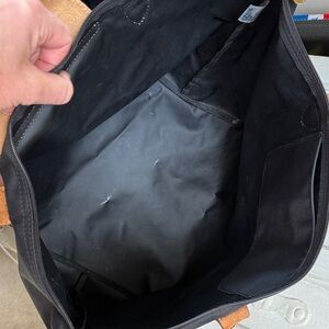 This stylish tote bag features a sleek black body complemented by rich brown handles. Perfect for everyday use, it combines elegance with practicality. There is some wear markings on the bag but they are not obvious. See photos. Still a great bag. Handles and leather have zero flaws. 20 in long, strap 10 in, width 7.5in, 12in tall