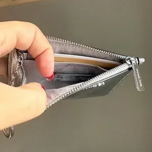 Perfect for on the go, this has three card slots, an ID window, and a larger slip pocket on the exterior, a zip pouch for cash + change with an additional card slot inside, and an attached key ring. It’s crafted from crackled metallic leather for statement appeal.