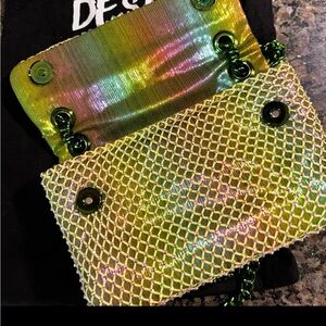 Stunning iridescent bag with a green chain. Features a unique textured design and a decorative clasp. Rhinestone for an extra shimmer.