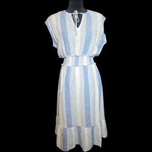 Easy, relaxed, great for travel and the weekends—that's the Ashlyn Dress. The midi dress has blue-colored stripes, an smocked waist, flowy skirt, and a ruffle tier at hem. It's cut from an airy, luxe linen that'll take you from spring to summer.