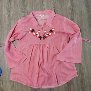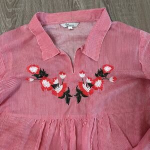 Features red & white micro stripes, beautiful floral embroidery, a soft flowy silhouette, and 3/4 bell sleeves with tie detail. Great everyday boho piece for spring or summer!
