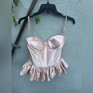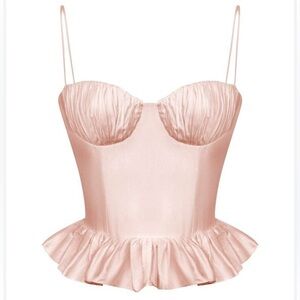 Always ready to take corsetry for a night out the label drapes this lustrous bodice along padded cups and a flattering peplum silhouette in silken satin.