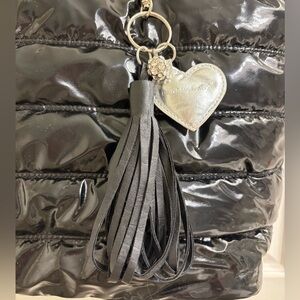 Shiny quilted puffer tote has 3-piece bag charm. Dual faux leather handles with about 8” drop. One zip pocket inside. About 18x12x7”