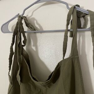 Army green color romper with tie/bow straps. Great condition, no noticeable flaws. 100% cotton, cute front pockets. Perfect for spring and summer. Can be dressed up or just for casual wear.