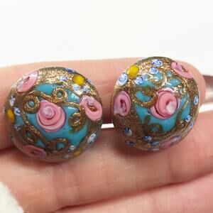 VTG Itlay Venetian Murano Fiorato Lampwork Wedding Cake Button Clip On Earrings