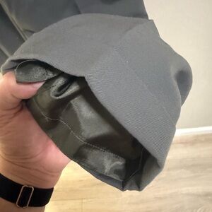 Elegant and timeless Austin Reed tailored suit set in a refined charcoal gray. Includes a structured single-button blazer with notched lapels and matching high-waisted pleated trousers with cuffed hems. Crafted from a smooth wool-blend fabric for a polished, professional look with all-day comfort. A classic piece for business, interviews, or formal occasions.