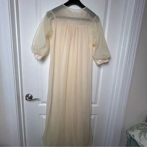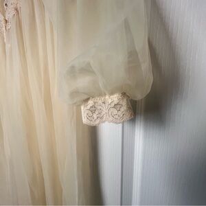 Beautiful vintage sheer, light peach bathrobe with lace and embroidery neck line. brand unknown, size medium. In excellent condition
