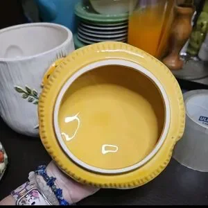 smaller one has a chip and Crack in ceramic, has been taped underneath, multiple pictures. smaller Canister has some small chip on rim and the mushroom below this has a small party that did not glaze on production, also pictured.