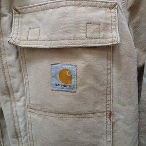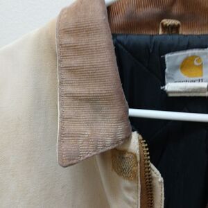 This is a size 44 regular Vintage Carhartt coat. It has holes, stains, rips, threads hanging, the zipper has one of the tags missing. It will zipper, you just have to wiggle it. This is a very worn in coat, as seen in photos. The inside, insulation inside coat is in great condition, as you can see in photos. My husband has worn it for years. Had to pry it off of him. He can't fit it around him anymore, from muscles becoming enlarged. That's his perception. It still has lots of life and will keep you warm. I do not was due to not knowing peoples allergies. Some it may smell like a million things out in nature. He used it to hunt in. As with any used clothing item expect signs of wear and tear, and strange smells. Open to reasonable offers.
