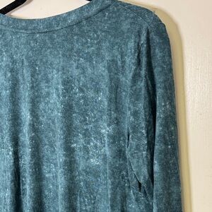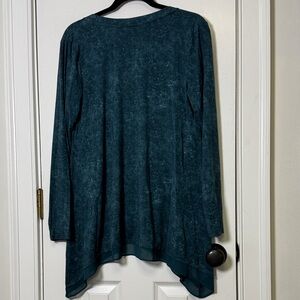 #LOGOByLoriGoldstein #LoriGoldstein #MineralWash #TealCardigan #BohoStyle #Lagenlook #AsymmetricalHem #ChiffonTrim #FlowyLayers #ButtonFrontCardigan #EverydayStyle #SoftAndStretchy #ComfyCute #LayeringPiece #BoutiqueStyle #CoastalBoho