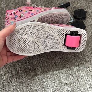 Heelys sneakers with built-in wheels. Tools to change it into flat shoes also included if you want to take the wheels out. size 13 C. Upper part is canvas with cloud design, super cute and fun with lots of wear left. They have some superficial wear, such as discoloration on the toes and on the sole slightly but overall in really good used condition from a non-smoking home.