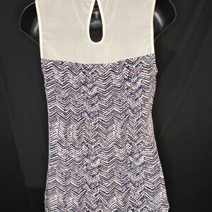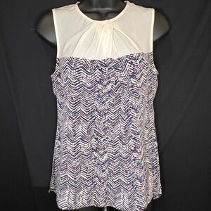 This elegant blouse by Trina Turk showcases a sleeveless design with a pleated white upper section and a vibrant purple chevron pattern on the lower half. The round neckline and lightweight fabric add a touch of sophistication, making it perfect for both casual and formal occasions. 25”L 17” pit to pit 349