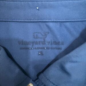Vineyard Vines men’s performance polo shirt, size XL, in navy blue. Made from a lightweight, stretchy performance fabric designed for moisture control and all-day comfort. Classic Vineyard Vines styling with a button placket and embroidered whale logo on the chest. Ideal for golf, workwear, travel, or casual outfits. Good used condition with normal wear. No material tag.